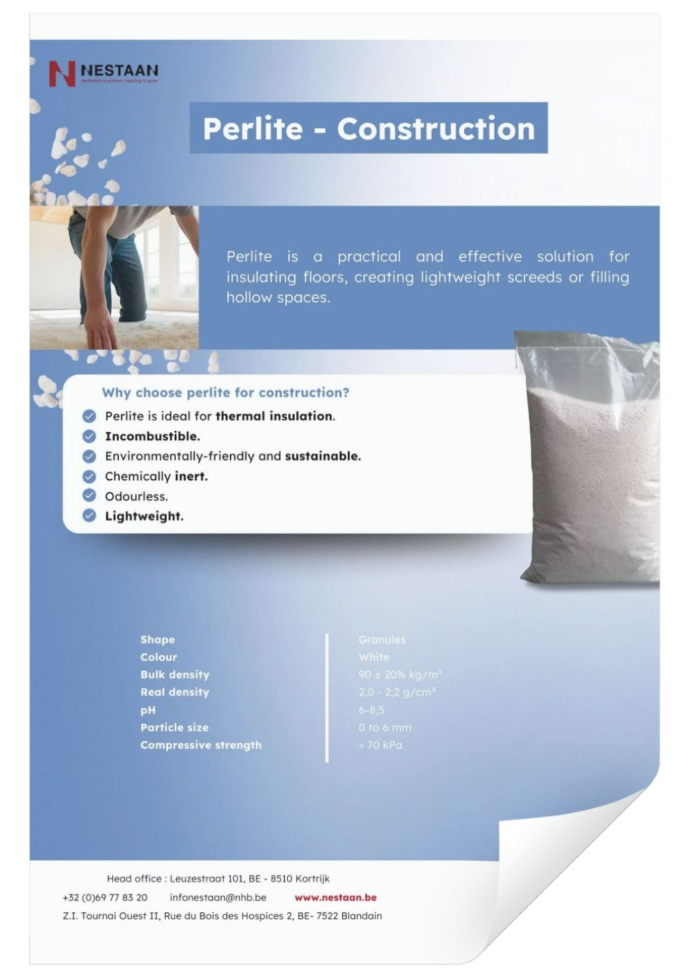 La perlite est une roche volcanique qui se dilate sous l'effet de la chaleur et prend plusieurs fois son volume initial. La perlite a plusieurs domaines d'application. Dans le secteur de la construction, elle est utilisée pour l'isolation des sols, comme chapes légères ou pour remplir des espaces creux. Comme elle peut être appliquée sans joints, la perlite convient parfaitement à l'isolation thermique.