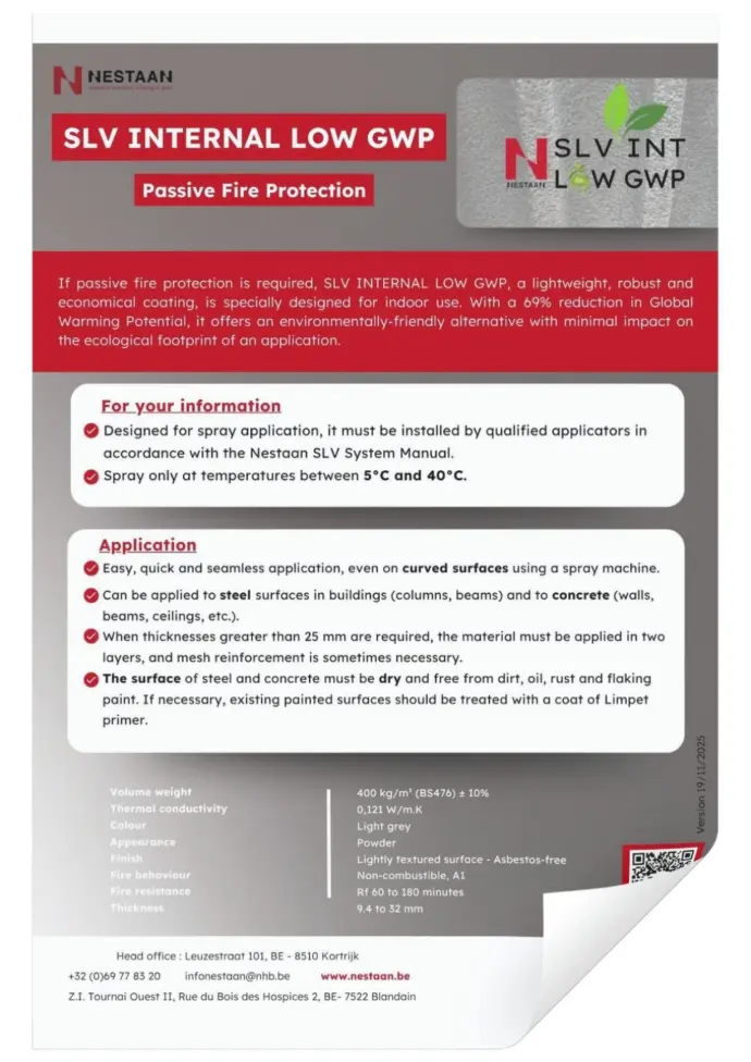 SLV Internal - LOW GWP est le premier mortier de protection passive contre l'incendie respectueux de l'environnement à obtenir une certification de résistance au feu pour le béton et l'acier par les principaux laboratoires internationaux de protection contre l'incendie tels que UL et ApPlus.