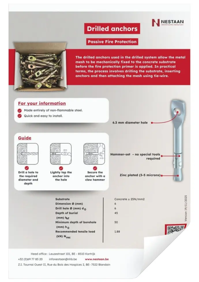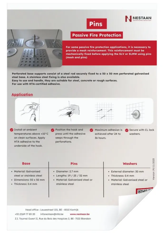 Pour certaines applications de protection passive contre l'incendie, il est nécessaire de prévoir une armature en treillis. Ce renforcement doit être fixé mécaniquement avant l'application du SLV ou du SLMW. Le treillis garantit une adhérence optimale dans les zones complexes ou fortement sollicitées de la protection contre l'incendie. NESTAAN propose deux types de systèmes de fixation qui peuvent être installés rapidement.